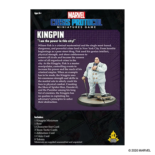As the Kingpin, Fisk is a master manipulator, controlling events to increase his power, influence, and the reach of his criminal empire. When an example has to be made, the Kingpin uses his enormous strength and martial arts skills to utterly crush his foes. Counting the likes of Spider-Man, Daredevil, and the Punisher among his long list of enemies, the Kingpin has no qualms in exploiting his adversary’s principles to usher in their destruction.